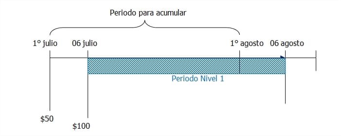 Periodo 1: El usuario ingresa saldo por un monto de $50.00 el 1° de julio, por lo que su periodo para alcanzar la tarifa Nivel 1 será del 1° julio al 1° de agosto. El día 06 de julio recarga $100.00 por lo que su tarifa preferencial Nivel 1, el cual estará vigente del 06 de julio al 06 de agosto.