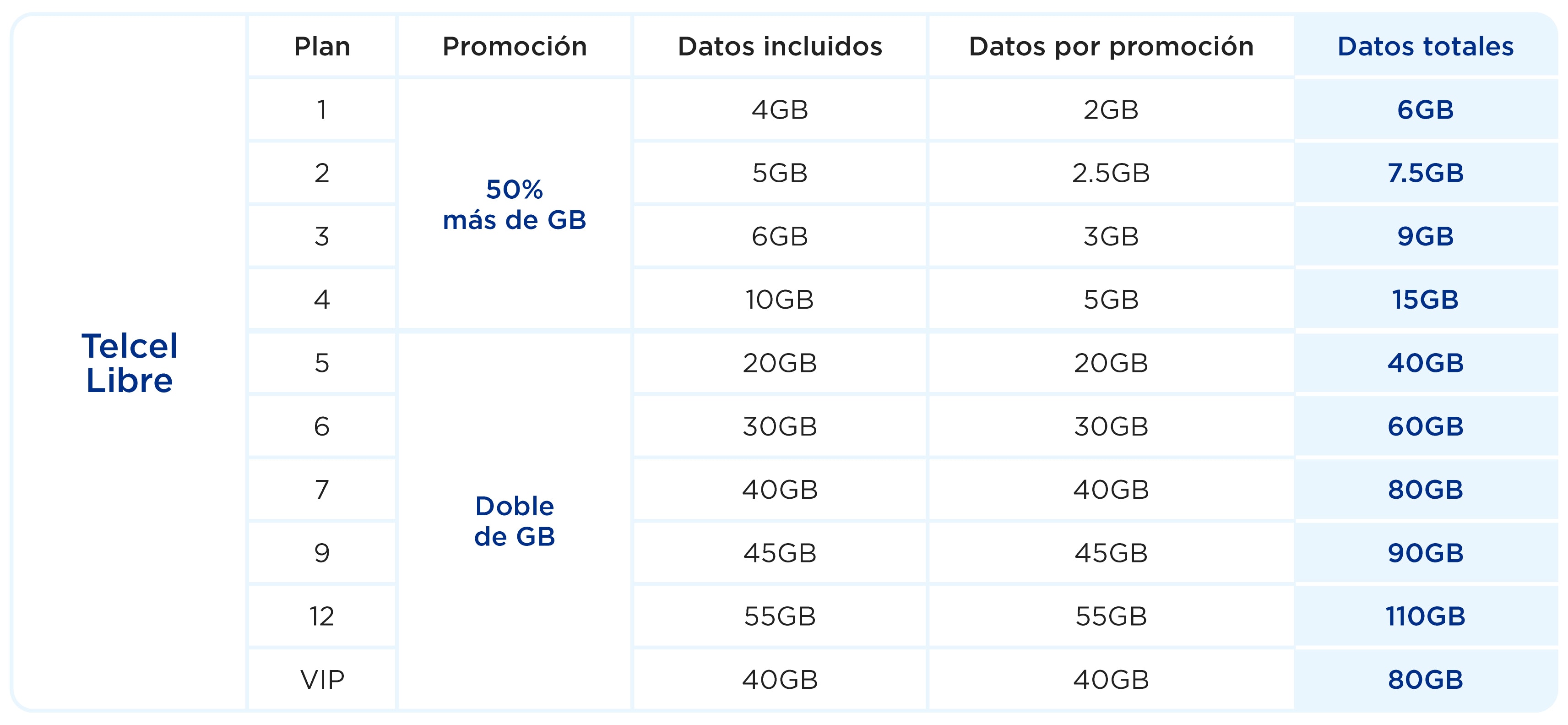 • Planes Telcel Libre 5 o mayor e Internet Libre 6 y 12: Una cantidad de datos adicional igual a la cantidad de datos para navegación libre incluidos en el plan contratado.