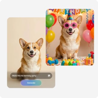 Haz ediciones de manera rápida y simple con solo unas palabras la AI. Agrega objetos, como accesorios en tu mascota con solo describirlas naturalmente y la Galaxy Al realizará tu visión en minutos